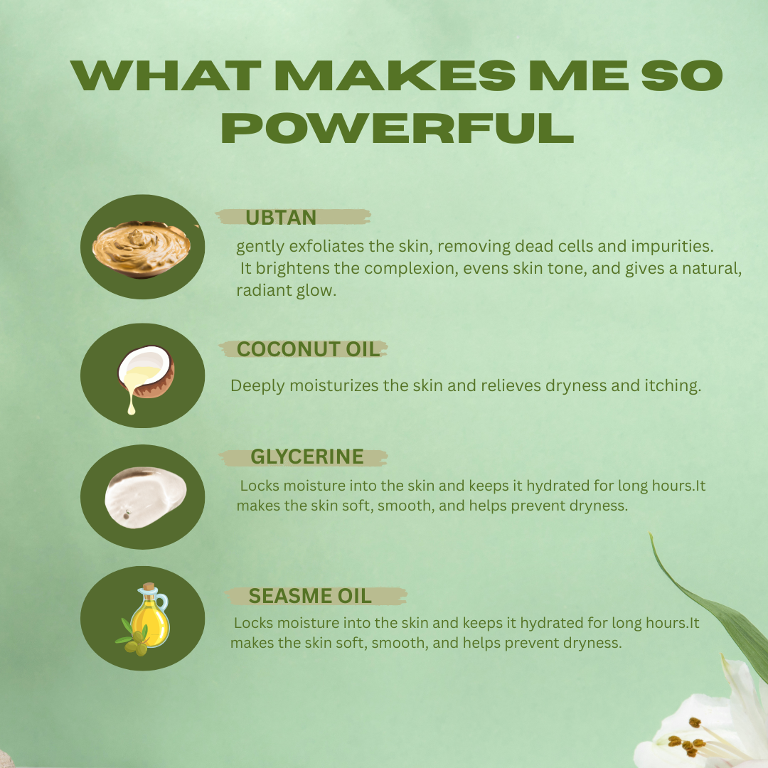 Turmeric • Sandalwood • Gram Flour • Glycerin • Natural Oils