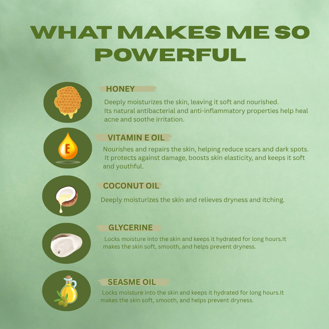 This soap contains skin-loving ingredients like coconut oil, vitamin E oil, castor oil, and glycerin, making it ideal for daily use — especially for dry, dull, or sensitive skin types.