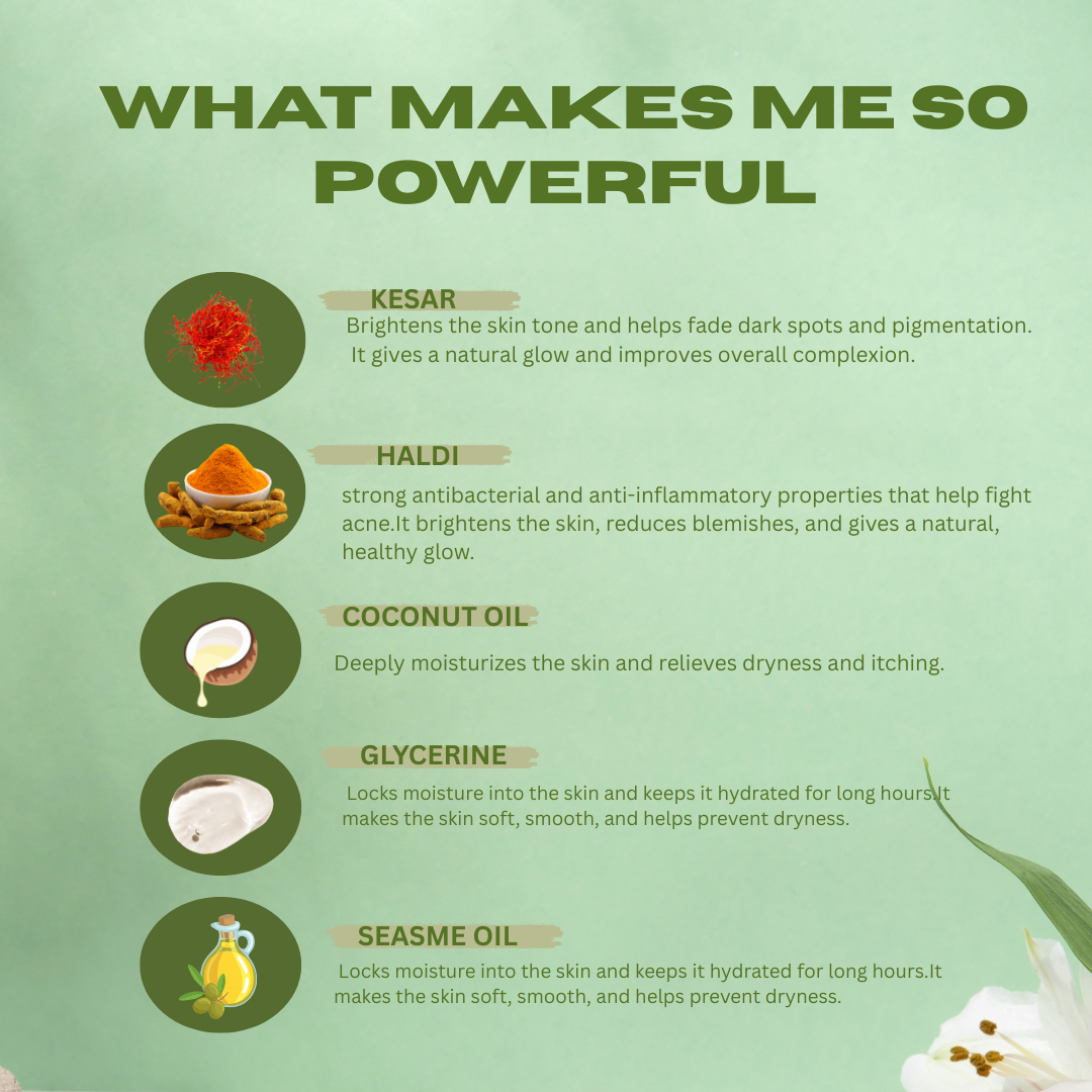 Pure Kesar • Haldi Extract • Glycerin • Coconut & Natural Oils